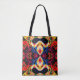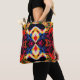 Esta bolsa de tote de cor brilhante apresenta um design caleidoscópico complexo que se assemelha à iluminação de néon psicodélico.