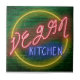 Que cozinha vegetariana não ficaria melhor com um sinal de neon? Vegan vermelho, cozinha azul, e um círculo amarelo como sinal de neon em uma parede de tijolos verde.