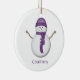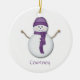 Bonito boneco de neve com chapéu roxo e cachecol. Personalize com o nome do seu filho nas costas.
