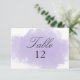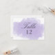 Este cartão de número de mesa apresenta uma bela névoa de lavanda em aquarela. A cor de fundo e os campos de texto podem ser personalizados ao seu gosto.
