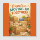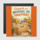 Celebrate the exciting milestone of moving in together with this warm and cheerful greeting card! Featuring a cozy illustrated scene of stacked moving boxes, soft packing paper, houseplants, furniture, and a shiny set of keys resting on top of a labeled box, this design perfectly captures the joy (and beautiful chaos!) of starting a new chapter under one roof.