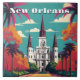 "new orleans louisiana travel", "st louis cathedral church", "retro colorful postcard poster", "jackson square blue castle", "french quarter america tourism", "american turquoise tourist souvenir", "vintage antique buildings usa", "famous landmark palm trees", "classic sights sites to visit", "autumn fall orange leaves"
