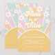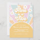 Nine é um convite de aniversário de 9 anos inspirado no sol retro pastel com dálias em estilo dos anos 70 e fontes e cores boho.
