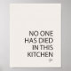 Esta poster de cozinha espirituosa mostra a frase "Ninguém morreu nesta cozinha ainda" em uma fonte preta e acentuou com uma textura canvas. Adicione humor à decoração da sua cozinha!