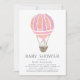 Celebre a sua menina a caminho com este convite chico e simples de chá de fraldas em aquarelas pastel moles. Design apresenta uma ilustração do balão de ar quente em cor-de-rosa e pêssego, com os detalhes do evento embaixo da cinza azul enfumaçado.
