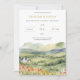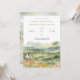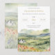 Este convite apresenta uma ilustração original de aquarela digital de uma cena ensolarada ambientada num vale com flores silvestres e uma casa encantadora.
