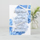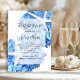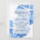 Realizar convites de janto com o texto "A noite anterior". Design do Jardim da Costa com lindas flores azuis de hydrangea e estrelas brancas. O texto preto é personalizado sobre um painel branco para uma aparência em camadas. Inclua quantas informações forem necessárias sobre o ensaio e/ou janto a seguir. O reverso é azul sólido. Mostrado em uma atualização de papel com um acabamento branco brilhante e textura tecida. Escolha qualquer papel.