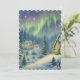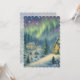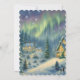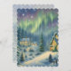 Esta carta apresenta uma floresta de inverno nevada à noite com estrelas e auroras no céu. As casas estão brilhantemente iluminadas. Mande Cartões de natal para sua família e amigos! Texto personalizado e traseiro.
