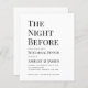 Um convite simples e minimalista para jantar ensaios em preto e branco. Tem apenas texto preto sobre fundo branco. O título "O Antes da Noite", a ocasião "Janto de ensaio" e o nome são escritos em bonés maiores, o restante em bonés pequenos. O texto fica alinhado.