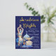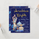 Noites árabes convites de festas de aniversários com belas ilustrações azuis e douradas sobre um fundo azul real. Esta maravilhosa festa de aniversário da noite árabe e este convite para eventos é facilmente personalizado para o seu evento simplesmente adicionando os seus detalhes de eventos. Você também pode mudar a cor de fundo para o que você preferir. Este é um design impresso sem brilho real, folha de alumínio, etc.