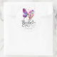 Um adesivo redondo de noiva com um design de borboleta floral boho e personalizado com nome, ano e agradecimento. É um adesivo de favor fofo para um chá de noiva, festa de despedida de solteira e festa de noivado.