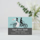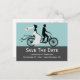 Cartão de aviso de data de casamento de bicicleta tandem fofo com uma noiva em um vestido de noiva com um pequeno coração vermelho no véu e um noivo em seu terno.. cartões-postais de casamento personalizados deslumbrantes.. adicione seu próprio texto .. produtos de casamento de designer por Ricaso