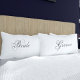 Uma fonte romântica e espiral usada neste par de fronhas de noite de núpcias. Você pode alterar o texto para os nomes da Noiva e do Noivo para que eles saibam de que lado da cama pertence a eles.