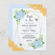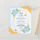 Estes convites de chá de panela apresentam um design floral de aquarelas com flores azuis de hydrangea, folhas, abelhas melíferas, favos de mel e uma estrutura geométrica falsa de ouro. Produtos correspondentes também disponíveis.