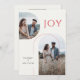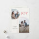 Esses cartões de saudação planos de 5" x 7" contêm espaços reservados para três fotos, dois nomes, ano e uma mensagem. A frente tem duas fotos arquivadas, uma vertical e outra horizontal. A saudação é "Joy", em letras vermelhas. O fundo é marfim. O verso tem uma foto vertical. A mensagem personalizável diz: "Estamos felizes em anunciar que nos envolvemos, e ambos desejamos paz e alegria nas férias e no ano que vem."