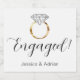 Estas etiquetas de vinhos espumantes personalizadas dizem Engaged! juntamente com um anel de noivado de diamante branco com dourado e a noiva e os nomes de noivos no fundo. Perfeito para uma festa de noivado!