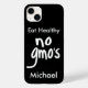 Promover sem OGM com este preto e a menção Comer Saudável. O caso é personalizado com um nome que pode ser excluído se você não quiser a personalização. Promover a sensibilização para os OGM e a alimentação saudável sem produtos de ogm. Expresse a sua opinião sobre as comidas geneticamente modificadas e os riscos para a saúde associados a estas comidas. Este caso de cobrir celular mostrará como você se sente com as palavras "no gmo's" em texto branco em negrito sobre fundo preto. As palavras personalizáveis "Coma saudável" podem ser alteradas para suas próprias palavras ou nome. Totalmente personalizável.