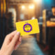 O fundo é a bandeira da orgulho para pessoas intersexo. É um anel roxo em um fundo amarelo. Há espaço para um nome personalizado e pronomes.