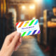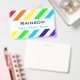 Um padrão de arco-íris e listras brancas com espaço para um nome e pronomes personalizados.