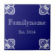 Azulejo do nome da família espanhola. Fundo azul. Personalizar cores.