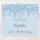 Um rótulo de garrafa de vinho para uma festa de aniversário de 21 ruas (ou qualquer idade) entre giros e glamourosos. Um fundo azul claro decorado com pingos de brilho, aparência de pingar tinta. Personalize e adicione uma data, nome, idade 21.O nome é escrito com um grande script de estilo escrito à mão.
