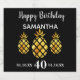 Uma etiqueta de garrafa de vinho para uma festa de aniversário de 40 anos. 3 abacaxis tropicais de cor dourada moderna. Fundo preto de música. Com o texto escrito: Feliz Aniversário. Modelo de nome, idade 40 e data de nascimento e data do aniversário. Cartas brancas.