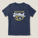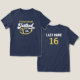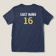 T-Shirt de futebol da Frente e Traseira Personalizada - mostrada no Design azul marinho apresenta a redação do roteiro "Futebol" com texto que pode ser personalizado para o nome da equipe, o sobrenome do jogador e o número de camisa. As cores branca, azul e dourada podem ser personalizadas.