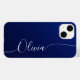 Blue Shimmer White Elegant Calliografia Script Personalizado Nome Personalizado iPhone 14 Smart Capa de telefone apresenta um design moderno e moderno simples e na moda com seu nome personalizado em elegante tipografia de escrita caligrafia escrita à mão sobre um fundo de shimmer azul metálico. Elaborado por ©Evco Studio www.zazzle.com/store/evcostudio