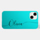Aqua Shimmer Black Elegant Calliografia Script Personalizado Nome Personalizado iPhone 14 Smart Capa de telefone apresenta um design simples e moderno e moderno com seu nome personalizado em elegante tipografia de escrita caligrafia escrita à mão sobre um fundo de ximmer aqua metálico. Elaborado por ©Evco Studio www.zazzle.com/store/evcostudio