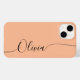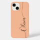 Peach Fuzz Elegante Black Calliografia Script Personalizado Nome Personalizado iPhone 14 Smart Capa de telefone apresenta um design moderno e moderno simples e na moda com seu nome personalizado em elegante tipografia de script de caligrafia escrita à mão em um fundo de pessegueira. Elaborado por ©Evco Studio www.zazzle.com/store/evcostudio