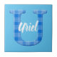 Nome dos rapazes com letra U inicial. Impressão de padrão de xadrez azul. Azulejos de cerâmica decorativa para o quarto de menino. O texto pode ser editado para tornar este azulejo exclusivo.