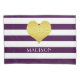 capas na moda púrpura e travesseiro de pares listrados brancos com um coração elegante de folha de ouro falso e impressões de nomes personalizados. Cobrir de duvet correspondente disponível no Dots & Stripes Design Studio.