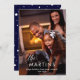 Este cartão de na moda apresenta uma caligrafia elegante com o sobrenome e fotografia da sua família, além de espaço para a sua saudação pessoal. A parte de trás é uma cor azul marinho profunda com pontos brancos abstrato.