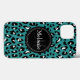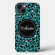 Adicione seu nome Na moda Blue Leopard Spots iPhone 13 Case - Legal e fofo padrão das manchas verdes, pretas e brancas, com a placa preta do nome para sua letra e nome iniciais do monograma personalizado. presente de excelente para meninas que amam padrões geométricos abstratos e presentes monogramas.