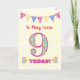 Um bonito cartão de 9 de aniversário para vocês personalizarem no cobrir frontal, com bunting de bolinhas, flores primatas e números cheios de um padrão primata, todos em um fundo amarelo pálido de gingham. A mensagem do cobrir frontal é 'To (space for you to add the name) 9 HOJE!' A mensagem dentro é apenas uma sugestão e você pode personalizá-la facilmente ou excluí-la se preferir.