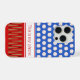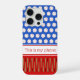 Esta capa de telefone padronizada de beisebol também pode ser personalizada com seu nome ou outro texto. Há um padrão brilhante de bolinhas de baseball em um fundo azul, e um padrão coordenado de morcegos de baseball em um fundo vermelho.