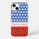Esta capa de telefone padronizada de beisebol também pode ser personalizada com seu nome ou outro texto. Há um padrão brilhante de bolinhas de baseball em um fundo azul, e um padrão coordenado de morcegos de baseball em um fundo vermelho.