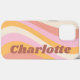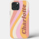 Girly Retro Vintage Wave Personalized Name Capa de telefone apresenta uma onda retrorativa em tons de rosa, laranja e branco com seu nome personalizado em elegante moderno roteiro acentuado. Personalize editando o texto na caixa de texto fornecida. Perfeito para o aniversário, Natal, Dia de as mães, chás de fraldas, chás de panela, mãe, irmã, primos, melhores amigos e muito mais. Elaborado por ©Evco Studio www.zazzle.com/store/evcostudio