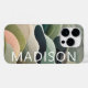 O moderno Abstrato Wavy Pattern Personalizado Name iPhone 14 Pro Capa de telefone apresenta um padrão de onda abstrato em cinza, verde e rosa com seu nome personalizado em tipografia branca moderna do script. Perfeito para presentes de Natal personalizados e feriados de inverno. Concebido por © Evco Studio www.zazzle.com/store/evcostudio