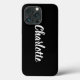 Nome personalizado do script na moda personalizado de capas de iphone preto fofo. Texto branco personalizável, fundo plano preto sólido.