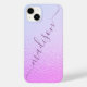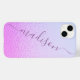 A Capa de telefone inteligente iPhone 14 Plus, do Iridescente Shimmer Rosa, Personalizado, apresenta um padrão moderno de shimmer iridescente, rosa e azul, com seu nome personalizado na tipografia de scripts de caligrafia escrita à mão roxa. Elaborado por ©Evco Studio www.zazzle.com/store/evcostudio