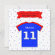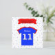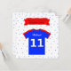 Estes cartões de agradecimento correspondem aos convites e outros itens na coleção de 11. A design mostra uma faixa vermelha de aniversário e uma camiseta esportiva azul sobre um fundo de estrelas azuis. Personalize a design das cartas adicionando o nome da criança de aniversário à t-shirt desportiva. O texto na faixa também pode ser personalizado ou você pode usar o padrão "Obrigado por vir à minha FESTA DE ANIVERSÁRIO". No verso há outra faixa de aniversário com texto personalizável adicional - o exemplo mostrado registra a data do partido.