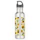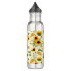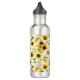 Nome personalizável e garrafa de água monográfica com um impressão de girassóis pintados de jardim, favos de mel e abelhas produtoras de mel, cores amarela e verde.