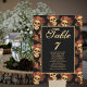Este cartão gótico com nomes dá as boas vindas aos seus convidados para a mesa com um padrão de crânios assustadores flutuando num abismo negro atrás do seu texto de monograma. Cada crânio é adorado com rosas vermelhas para sua ocasião romântica no Halloween. Os seus olhos vazios e sem alma são nitidamente contrastados contra a coroa gótico e buquês de flores mortos. Par com o nosso gráfico de assentos de gótico.