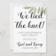 Compartilhe suas notícias felizes com este encantador anúncio de fuga para se casar, apresentando um design botânico moderno e uma fonte divertida que diz “Nós amarrámos o nó!” Folhas suaves em aquarela acentuam a parte superior, adicionando um toque natural e romântico à tipografia preta e branca abaixo. O anúncio detalha uma cerimônia privada em um layout limpo e minimalista, elegante e fácil de ler.
