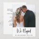 Esses anúncios de casamento e convites de festa simples e elegantes apresentam sua foto pessoal na frente, com uma fonte escrita à mão preta e moderna que diz "nós fugimos". Há espaço para adicionar seus nomes e a data. Um visual fresco e moderno que é a maneira perfeita de informar amigos e familiares que você está casado e convidá-los para a festa de celebração pós-casamento.