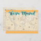 O contraste entre o antigo e o novo é evidente neste cartão de anúncio de realocação único "Nós nos movemos", com um mapa do mundo antigo e um pino de posicionamento do ícone do computador.