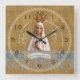 O relógio da parede quadrada de Lady de Fatima. Dourada visão de fundo. Rainha do Céu - Reze por nós.