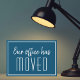 Temos um novo cartão de anúncio de mudança de endereço para uma empresa moderna ou corporação sofisticada que deseja atualizar seus clientes sobre um novo local. Nosso escritório mudou. Tipografia minimalista e elegante em cartões azuis e brancos para a sua empresa. Personalize a mudança de endereço no verso.