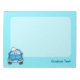 Caricatura azul sorridente com bolhas de sabão. Cor de fundo personalizada. Texto personalizado.
